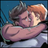 Description: In semi-darkness, Rictor and Shatterstar embrace, with Rictor's head on Shatterstar's shoulder