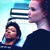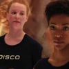 Description: Michael, far right, looks on, in her starfleet uniform